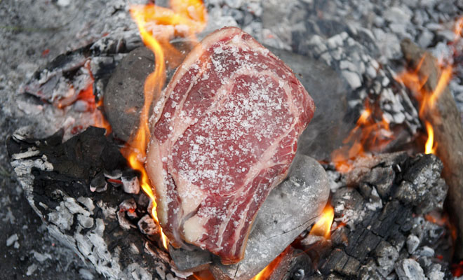 Когда образуется уголь и он раскалится, его следует распределить так, чтобы получился более-менее ровный слой. Сформировавшуюся золу необходимо сдуть самодельным «опахалом» из газеты. Перед приготовлением стейки не приправляют, а просто выкладывают на угли и оставляют на 4-6 минут для прожарки medium-rare, после чего с помощью щипцов с длиной ручкой переворачивают и готовят еще 4-6 минут с другой стороны.
