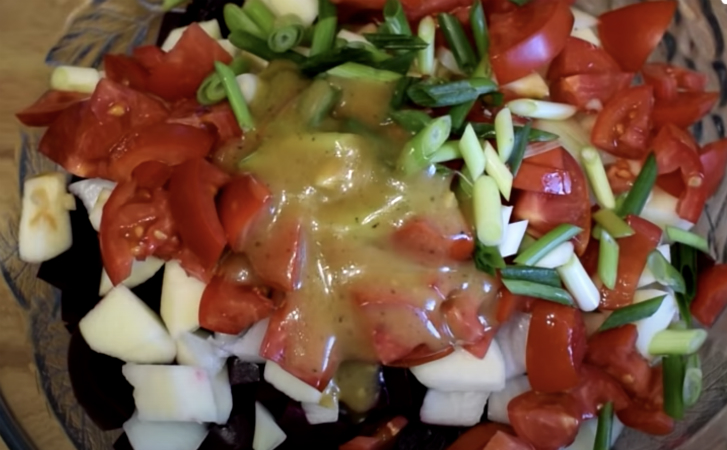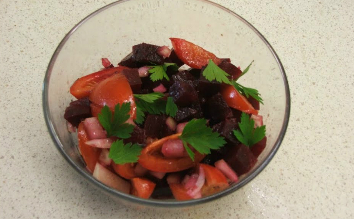 Зимние салаты традиционно довольно затратны, поэтому их редко получается готовить постоянно. На самом деле можно поступить и проще, приготовив не менее вкусный салат почти без затрат: добавим к вареной свекле лук и помидор, быстро сделаем заливку на горчице и масле и салат готов.