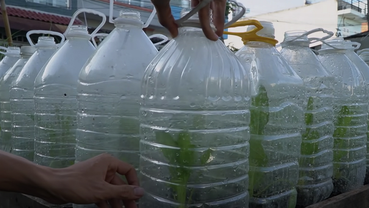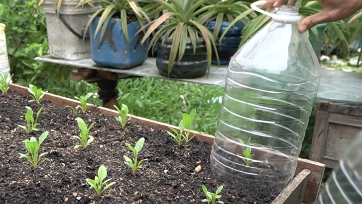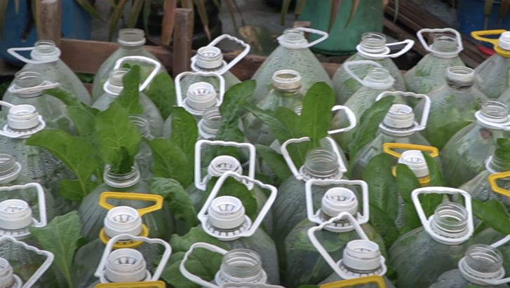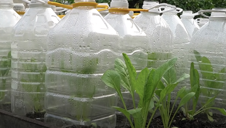 Весенние посадки, такие как шпинат, очень теплолюбивы. Высаживать их в марте обычно рано — заморозки все еще могут ударить в любой момент. Строить отдельную теплицу для них накладно и времени займет достаточно долго. Пластиковая тара (удобнее брать 5-литровые емкости, оставшиеся из-под воды) решает обе эти проблемы.