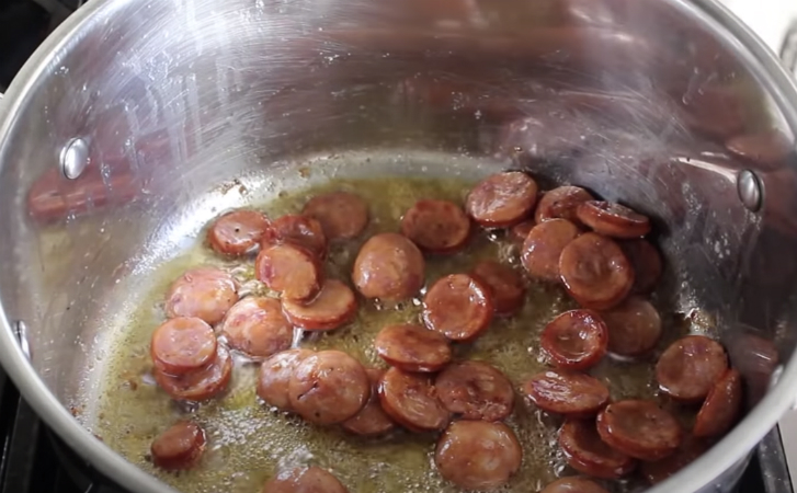 1. Растапливаем масло прямо в кастрюле на среднем огне. Кладем туда же колбасу и помешивая доводим ее до золотистости, это займет около 3 минут. Затем колбасу перекладываем в отдельную миску.