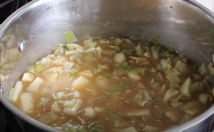 3. Добавляем куриный бульон, огонь делаем максимальным и доводим все до кипения. Не забывайте помешивать, чтобы мука не прилипла ко дну кастрюли. Добавляем капусту и варим две минуты, следом кладем картошку, опять доводим до кипения. Кладем черный перец, кайенский перец, лавровый лист.