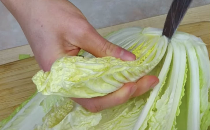 Теперь разрезаем кочан пекинской капусты пополам. И на одной половине аккуратно отсоединяем листья друг от друга, но не до конца.