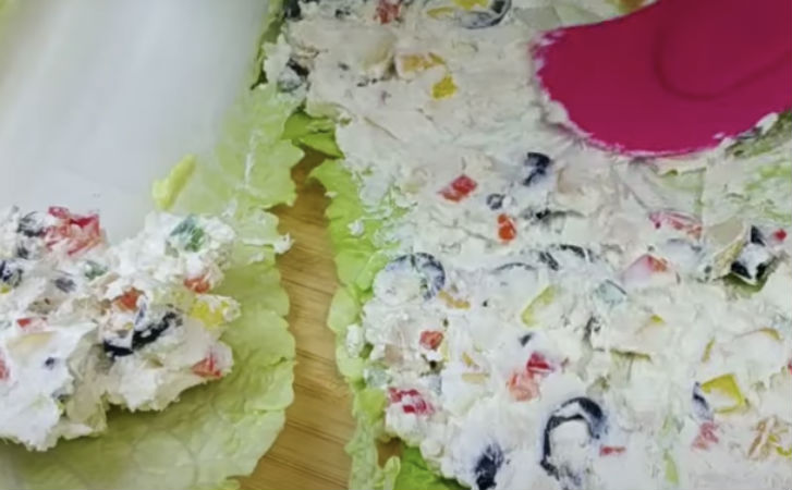 На каждый лист наносим слой салата и очень аккуратно сворачиваем кочан вместе.