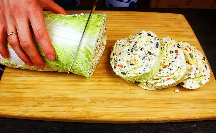 Заворачиваем кочан в пленку, даем остыть в холодильнике два часа и закуска готова.