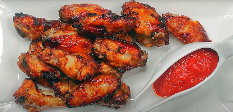 4. Разогрейте духовку до 220 °C с режимом «гриль» и включенной конвекцией. Уложите крылышки на решетку, под решетку можно поставить противень, чтобы капающий маринад не пачкал духовку. Запекайте 25–30 минут, периодически проверяя, чтобы крылышки не подгорели. Они должны стать золотистыми и хрустящими снаружи, но сочными внутри.