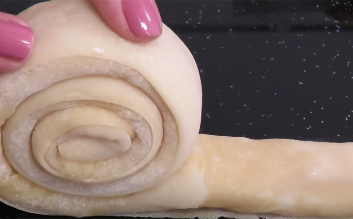 Сворачиваем полоски в рулет, затем уже рулет раскатываем в лепешку и быстро жарим их на сухой сковороде.
