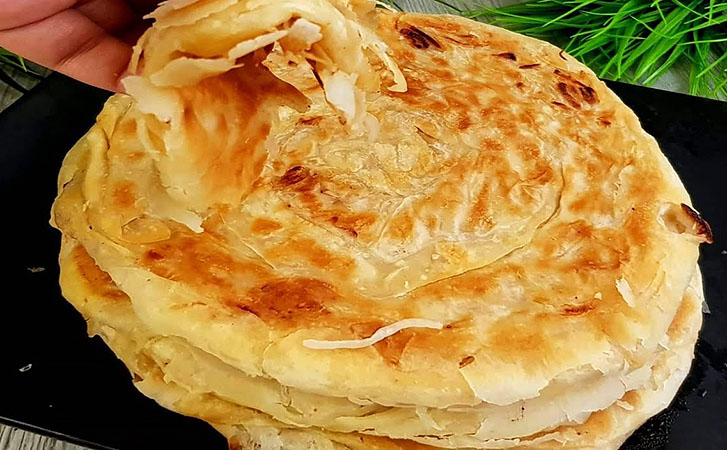 Покрываем ее сверху растопленным сливочным маслом, затем каждую лепешку складываем в полоску и полоски накладываем друг на друга.