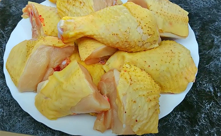 1. Курицу промойте, обсушите бумажными полотенцами и нарежьте на порционные куски среднего размера. Сложите в глубокую миску, посолите, добавьте хмели-сунели и несколько горошин душистого перца. Тщательно перемешайте, чтобы специи равномерно распределились по мясу, и оставьте при комнатной температуре примерно на 15–20 минут.