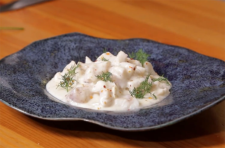 В процесс такой готовки минтай приобретает благородный белый цвет, а его текстура становится удивительно нежной. Он сухости и жесткости не остается и следа!