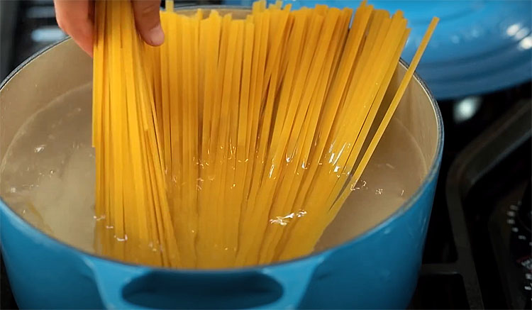 1. Вскипятите подсоленную воду и сварите пасту до состояния аль денте. Слейте воду, оставив немного (около стакана) отвара — он может пригодиться для регулировки густоты соуса.