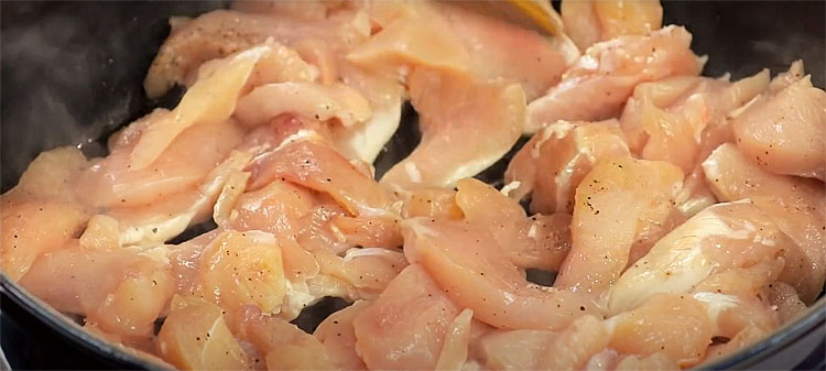 2. Нарежьте куриное филе тонкими полосками. Приправьте солью и черным перцем. Обжарьте курицу на сильном огне с оливковым маслом до золотистой корочки. Переложите на отдельную тарелку.