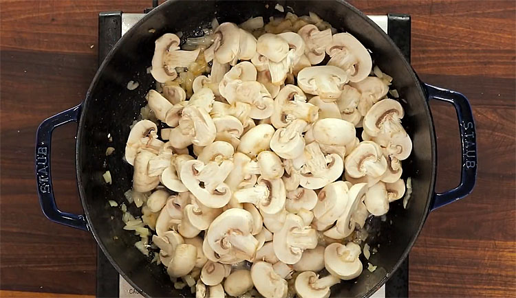 3. В той же сковороде (лучше с высокими бортиками) разогрейте немного оливкового и, при желании, сливочного масла. Обжарьте мелко нарезанный лук около 3 минут. Добавьте нарезанные шампиньоны, готовьте еще 7 минут до мягкости и испарения жидкости. В самом конце добавьте измельчённый чеснок и тушите 30 секунд.