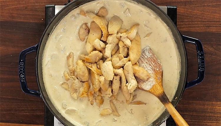 4. Влейте в сковороду смесь молока и сливок. Варите на сильном огне около 8 минут до легкого загустения. Верните обжаренную курицу в сковороду, перемешайте, приправьте солью и перцем.