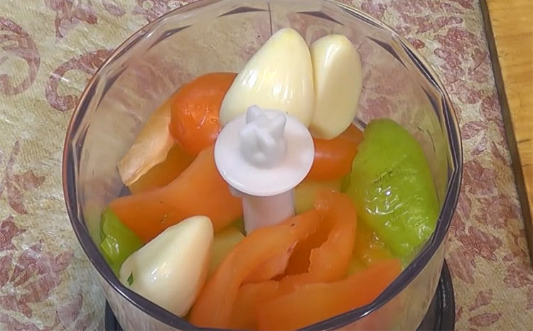 2. Нарезанные мелкими кусочками сладкий и горький перцы вместе с чесноком измельчаем в блендере до состояния однородной, похожей на пюре, массы.
