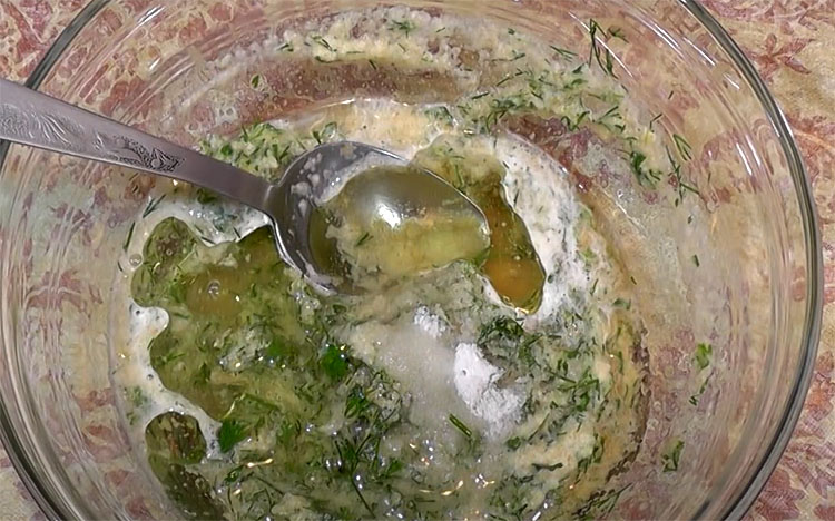 3. Содержимое блендера переливаем в тарелку с измельченной зеленью, добавляем соль, растительное масло, уксус и сахар, после чего как следует перемешиваем. Заправка готова!