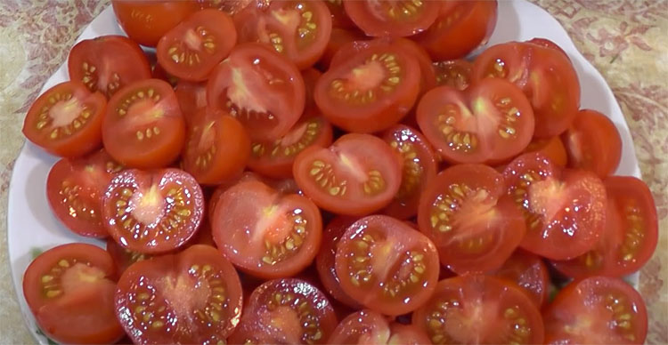 5. Поливаем первый слой помидоров заправкой, после чего выкладываем следующие, не забывая каждый новый слой обильно сдабривать заправкой.