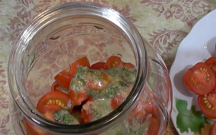 4. Помытые и нарезанные — в зависимости от размера пополам или на четвертинки — помидоры укладываем в стеклянную банку так, чтобы закрыть дно.