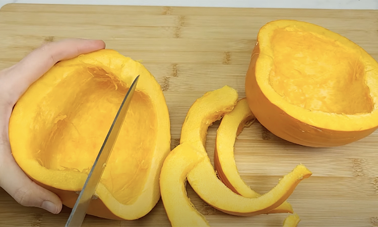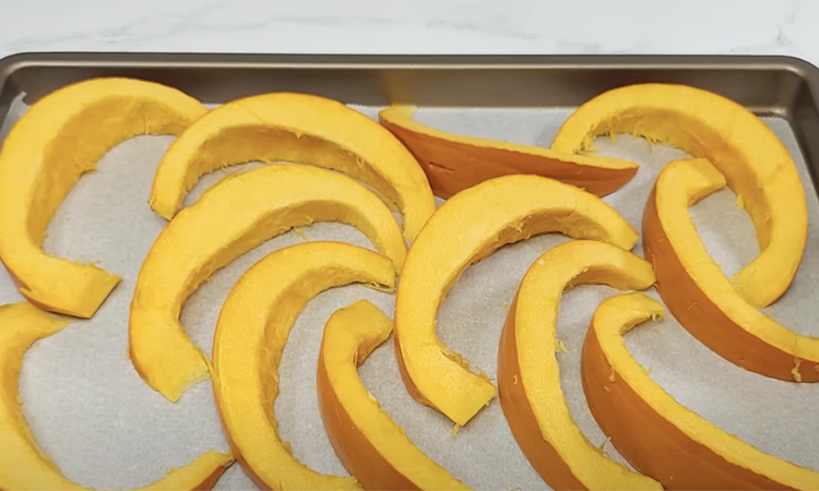 Тыкву нам нужно будет предварительно подготовить к дальнейшей работе. Режем ее дольками, как дыню, раскладываем на противне и отправляем на 14 минут в духовку при 190 градусах.