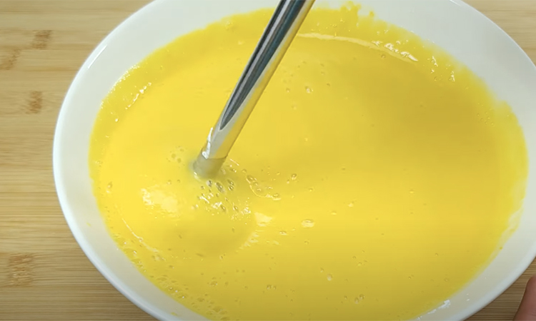 Достаем тыкву, режем в отдельную миску небольшими дольками. Туда же натираем цедру 1 апельсина, высыпаем еще 60 граммов сахара, разбиваем 2 яйца и снова погружным блендером перемалываем все.