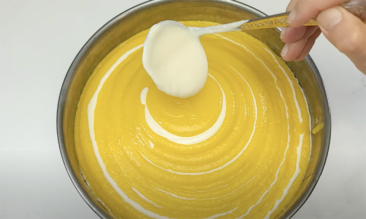 Теперь застилаем круглую форму пергаментной бумагой и поочередно вливаем тыквенную и творожную массу до самого верха.