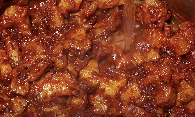 Бекон и мясо нарезаем примерно равными небольшими кубиками. Лук мелко шинкуем. В глубокой кастрюле первым распускаем 60 граммов сала и обжариваем до легкой золотистости лук. Солим, добавляем туда же мясо и бекон. Жарим все вместе на умеренном огне 10 минут. Не забывайте помешивать, мясо и лук не должны пригореть.