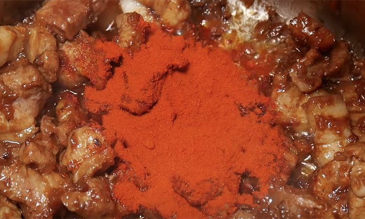 Затем высыпаем в кастрюлю паприку. Заливаем воду, накрываем крышкой и делаем огонь чуть ниже среднего. В отдельной кастрюле варим до размягчения квашенную капусту и перекладываем ее к мясу.