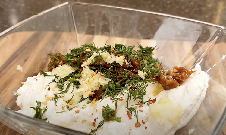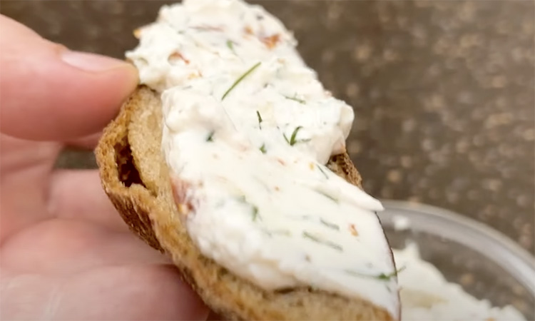 Если ничего не добавлять, он будет иметь приятный сливочный вкус. Но мы добавим немного мелко нарезанного укропа и вяленых помидоров, в этом варианте сыр уже можно подать как полноценную намазку к завтраку.