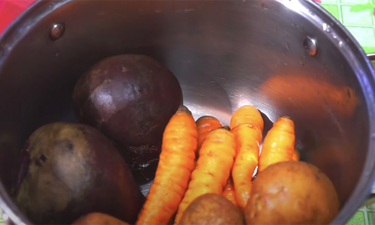 Свеклу, картошку и морковь отвариваем в подсоленной воде в одной кастрюле. Это удобнее сделать даже до начала приготовления салата, чтобы не тратить времени. Затем уже по отдельности натираем отварные овощи на крупной терке. Лук шинкуем мелкими кубиками, шпроты перекладываем из банки в миску и разминаем вилкой. Пора формировать салат. В глубокую емкость первым слоем выкладываем половину всей картошки и разравниваем.