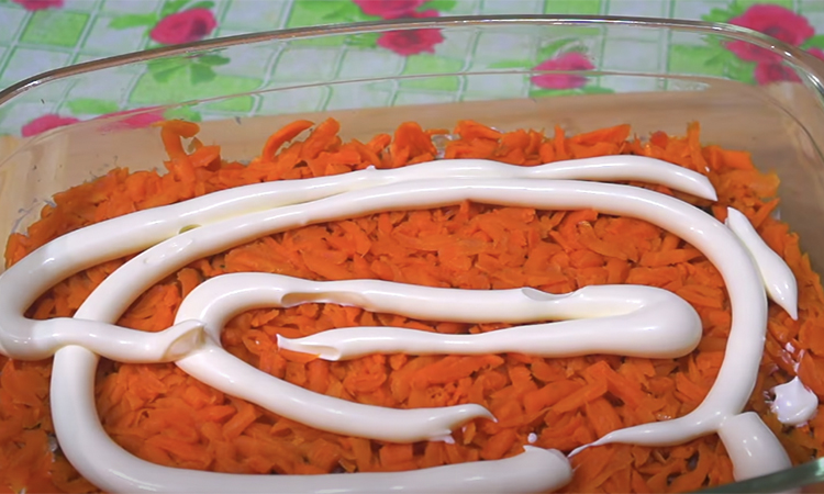 На нее распределяем лук и промазываем майонезом. Следующий слой шпроты, затем морковь, снова майонез и опять картофель. Его мы также смазываем майонезом, распределяем сверху отварные яйца. Солим, теперь кладем слой свеклы, разравниваем и также смазываем майонезом. Дайте салату пропитаться и он готов к подаче.