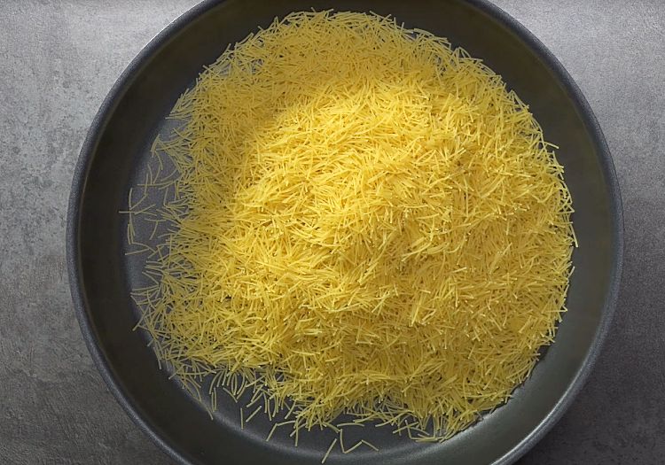 1. Поставьте сковороду на средний огонь и дайте ей прогреться. Добавьте вермишель на сковороду и обжарьте ее до золотистого цвета, постоянно помешивая. Это займет от 8 до 10 минут.