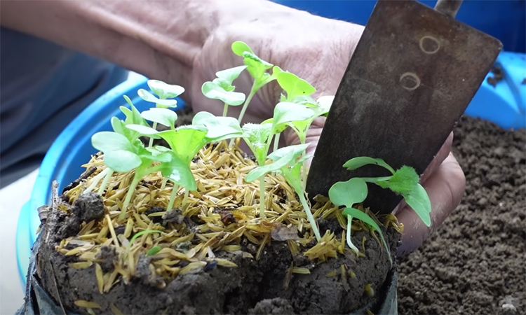 Сначала проращиваем пекинскую капусту в небольших емкостях с грунтом. Через семь дней их можно переместить уже в основные ведра. Грунт засыпаем до самого верха, в каждое ведро размещаем по два ростка. Пекинская капуста любит воду, поэтому сразу обильно поливаем ростки — делать это потребуется затем каждые два-три дня.