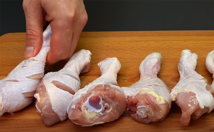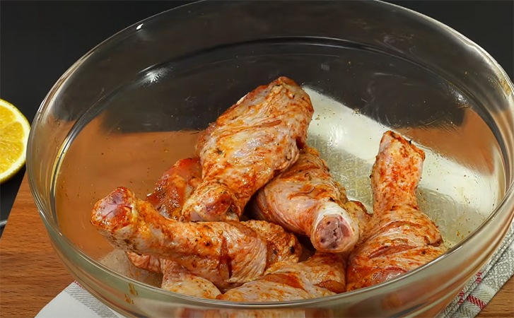 На каждой голени делаем несколько глубоких надрезов ножом, затем перекладываем их в глубокую миску. Добавляем соль и перец, приправу, паприку и масло. Перемешиваем и оставляем мариноваться на 30 минут.