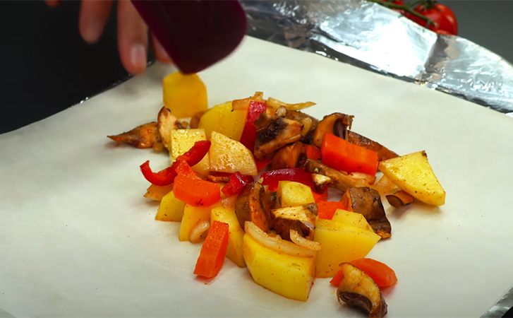 Тем временем в отдельную миску нарезаем небольшими, примерно равными кубиками картофель, морковь, грибы, перец и лук. Сюда же мелко шинкуем чеснок, также добавляем паприку, соль, перец и масло. Аккуратно все перемешиваем. Делим на шесть равных частей бумагу для выпечки и фольгу.