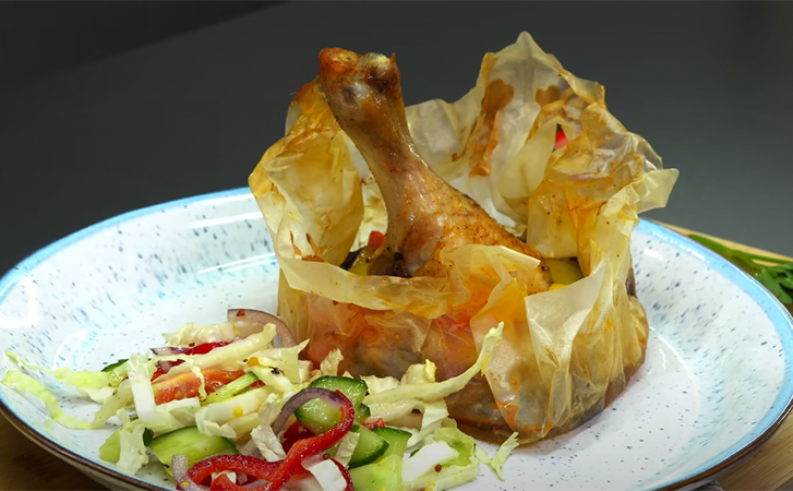 Бумагу кладем на фольгу, в нее выкладываем овощную смесь, затем распределяем куриные голени. Закрываем фольгу.
