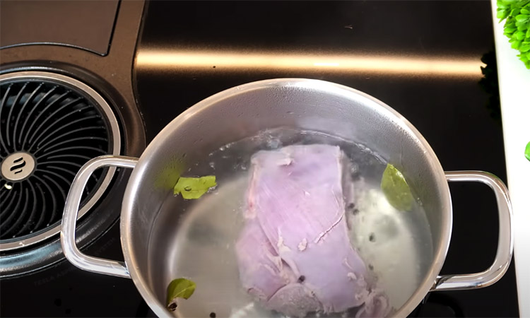 Начнем с отваривания мяса. В кастрюлю налейте воды, добавьте соль, лавровый лист и перец горошком. Доведите до кипения. Когда вода закипит, опустите в нее бедро индейки, закройте крышкой и варите 35 минут на среднем огне. Затем выключите, не вынимая из бульона, и дайте остыть - мясо будет максимально сочным.
