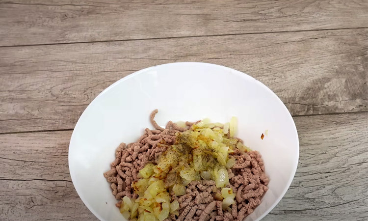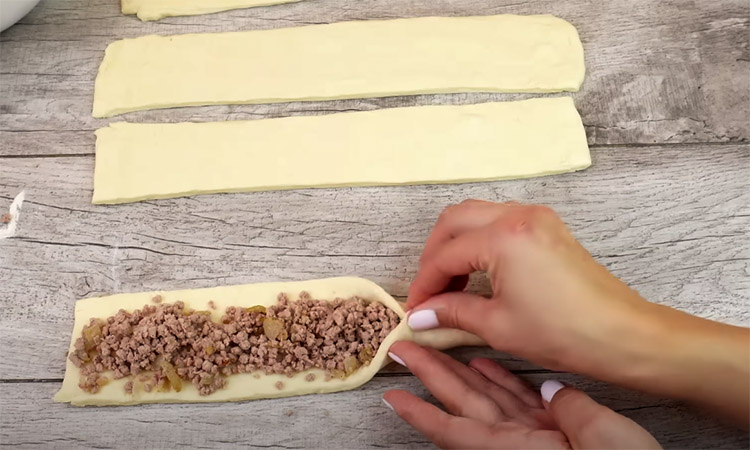 Разрежем луковицу кубиками и обжарим на растительном масле. Добавим к перекрученному мясу, посыпаем чёрным перцем, перемешиваем, пробуем на соль - начинка готова. Теперь берем слоёное тесто (здесь в рецепте слоёное дрожжевое), раскатываем его, разрезаем на четыре полоски.