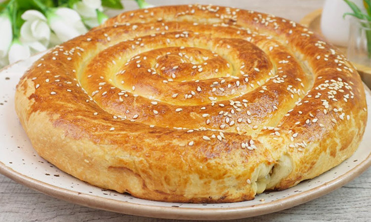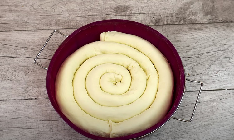 Смазываем форму растительным маслом, скручиваем заготовки в спираль, смазываем яичным желтком, посыпаем кунжутом.