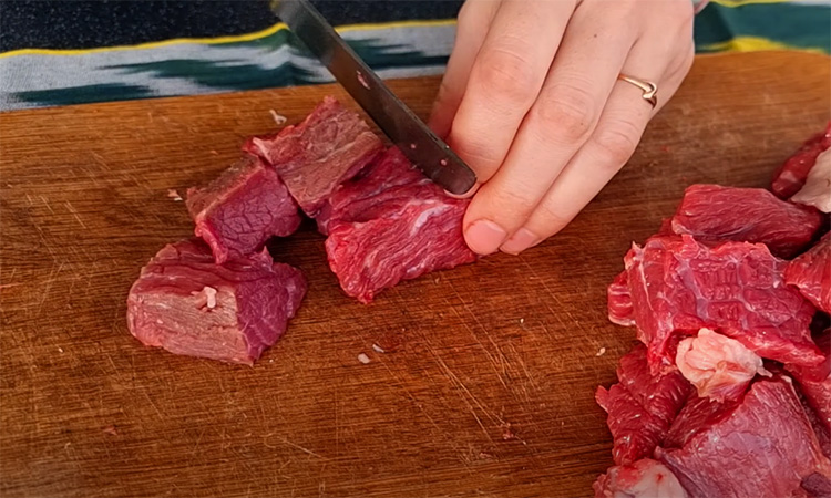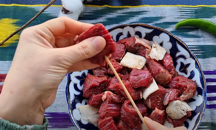 Говядину и курдючный жир режем среднего размера кубиками, складываем вместе в тарелку и приправляем солью, кумином, кориандром. Затем поливаем растительным маслом, перемешиваем и убираем в холодильник на 2 часа.