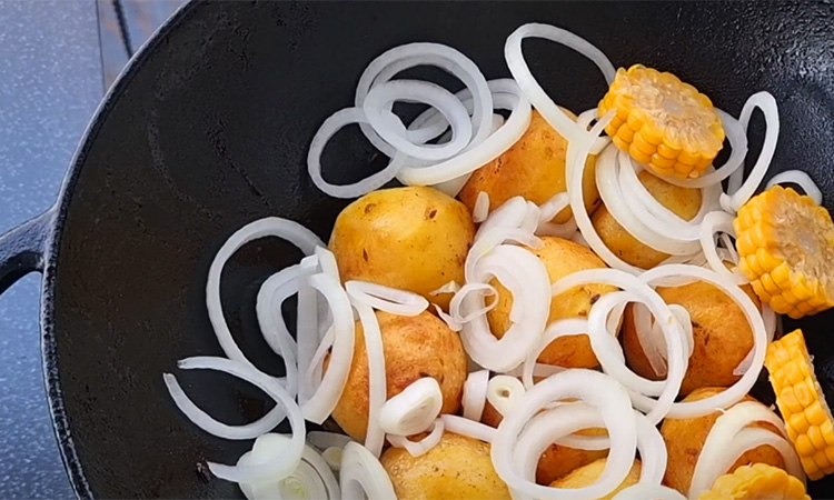 Жарим до румяной корочки, затем добавляем в казан нарезанный кольцами лук и фасоль, солим, выкладываем сверху шпажки с мясом, заливаем водой и тушим в течение 60 минут.