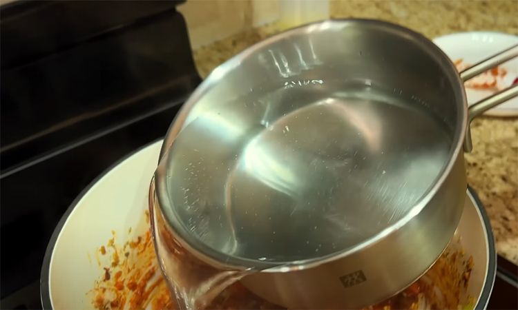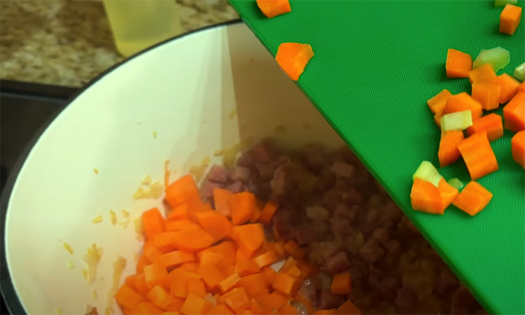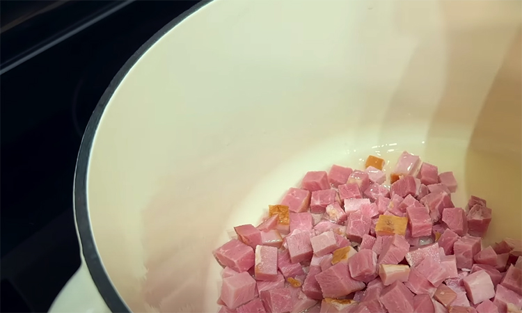 Нарежьте копченую ветчину и лук мелко. В кастрюле разогрейте масло и обжарьте их до золотистого цвета. Добавьте нарезанную морковь и сельдерей, тушите их вместе до мягкости. После того как овощи станут мягкими, добавить чеснок, затем приправу "Хмели-сунели", сушеный орегано, сушеную петрушку и сушеный укроп. Обжарить специи вместе с овощами в течение минуты, чтобы они раскрыли свой аромат.