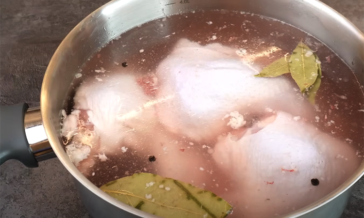 В кастрюлю налейте 2 литра холодной воды и добавьте 6 столовых ложек соли, лавровый лист и перец горошком. Перемешайте и опустите куриные окорочка в солевой раствор. Накройте кастрюлю крышкой и оставьте на 2-3 часа в прохладном месте. Соль за это время вытянет из курицы всё ненужное и насытит мясо влагой. Достаньте курицу из солевого раствора и обсушите. В отдельной миске смешайте лимонный сок, соевый соус и смесь перцев. Натрите курицу получившимся маринадом, накройте плёнкой и уберите в холодильник на 5-6 часов или на ночь.