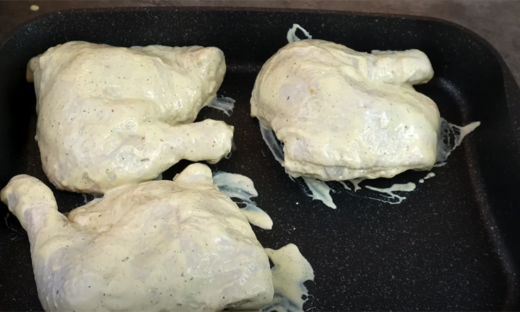 За час до приготовления подготовьте йогуртовый соус. В миске соедините натуральный йогурт, горчицу и приправу для курицы. Хорошо перемешайте. Достаньте курицу из маринада, удалите лишнюю жидкость и смажьте соусом из йогурта. Оставьте на 30 минут. Разогрейте духовку до 200 градусов. Выложите курицу на противень, накройте фольгой и запекайте 40 минут.