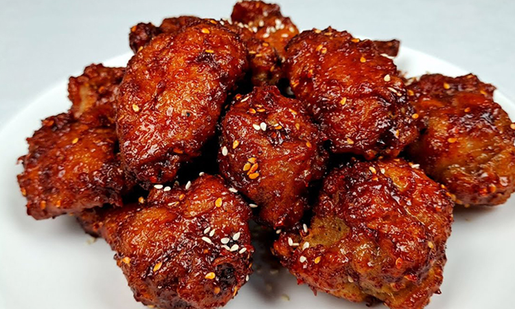 В Южной Корее такая курица не просто закуска, это скорее повод пригласить друзей на вкусный и сытный ужин. Мясо обязательно маринуют в молоке, жарят дважды и подают в остром соусе с перцем и пастой кочудян. Хрустящую корочку обеспечивает контраст текстур муки и кляра.