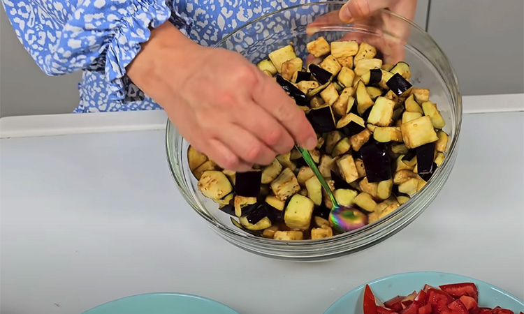 Нарежьте баклажаны кубиками примерно сантиметр на сантиметр, посыпьте чайной ложкой соли, перемешайте и оставьте на 15 минут. Слейте выделившийся сок, не промывая овощи. Нарежьте болгарский перец такими же кубиками. Нарежьте лук полукольцами или кубиками, как для поджарки. Очистите и нарежьте помидоры сочными дольками. Нарежьте острый перец мелкими кусочками. Нарежьте картофель кубиками и отварите до состояния, когда он полностью разварится и начнёт распадаться.