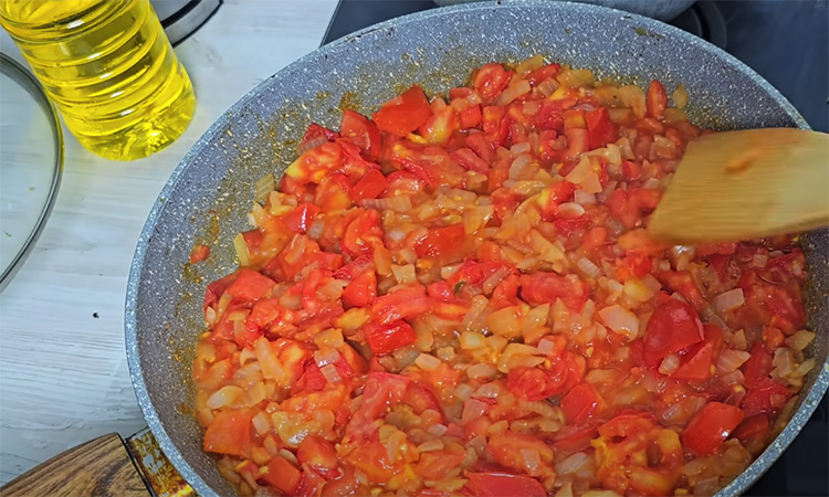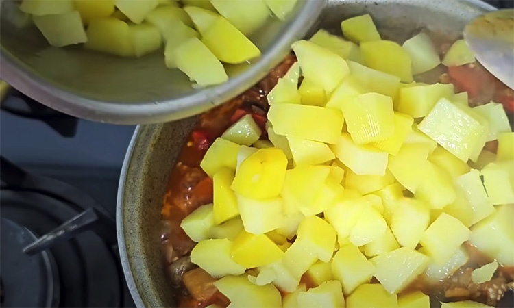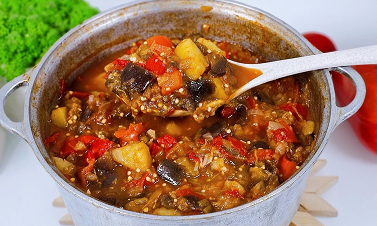 Добавьте нарезанные помидоры и тушите на среднем огне 5 минут, пока они не пустят сок. Снимите с огня и вылейте эту массу в казан к баклажанам и перцу. Перемешайте, накройте крышкой и тушите всё вместе на слабом огне 15 минут. Слейте воду с картофеля и добавьте его горячим к овощам. Положите мелко нарезанный острый перец, измельчённый чеснок и посолите по вкусу. Перемешайте аккуратно, стараясь сохранить кусочки овощей целыми. Накройте крышкой и оставьте томиться ещё 10–15 минут на слабом огне.