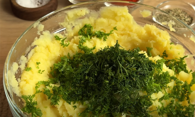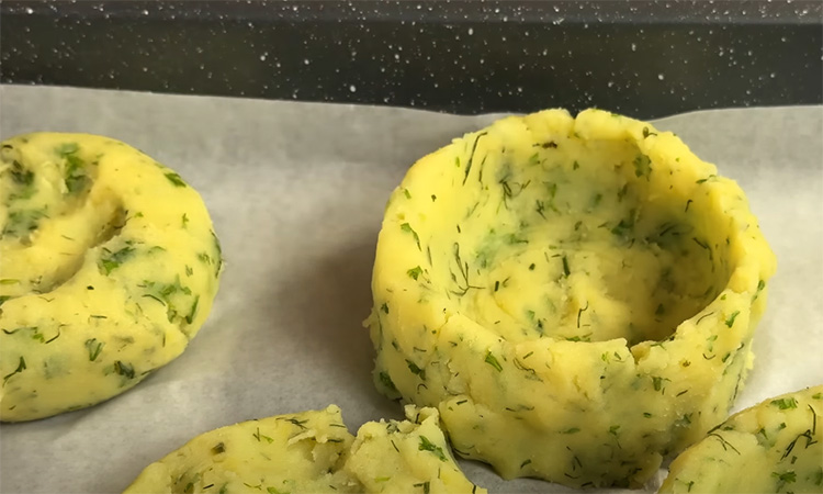 Очистите картофель, нарежьте и отварите в подсоленной воде до мягкости. Слейте воду и разомните картофель в пюре. Добавьте мелко нарезанный укроп и петрушку, перемешайте. Дайте слегка остыть. Из теплого картофельного пюре сформируйте гнезда: скатайте шарики, выложите их на противень с пергаментом и пальцами или дном стакана сделайте углубления в центре, формируя бортики.
