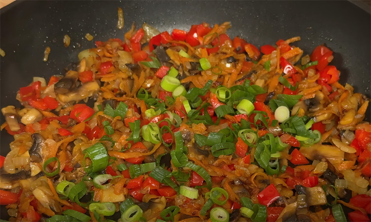 Для начинки мелко нарежьте лук, морковь натрите на терке, перец и грибы нарежьте кубиками. Обжарьте лук на растительном масле до мягкости, добавьте морковь и готовьте еще 3 минуты. Выложите грибы и перец, продолжайте тушить 5–7 минут. Добавьте нарезанный зеленый лук и измельченный чеснок, посолите, приправьте перцем, паприкой и травами.