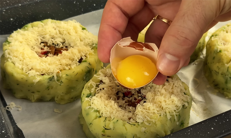 Перемешайте и дайте остыть. Заполните картофельные гнезда овощной начинкой. Посыпьте сверху тертым сыром. В центре каждого гнезда сделайте углубление и аккуратно выложите по одному яичному желтку.