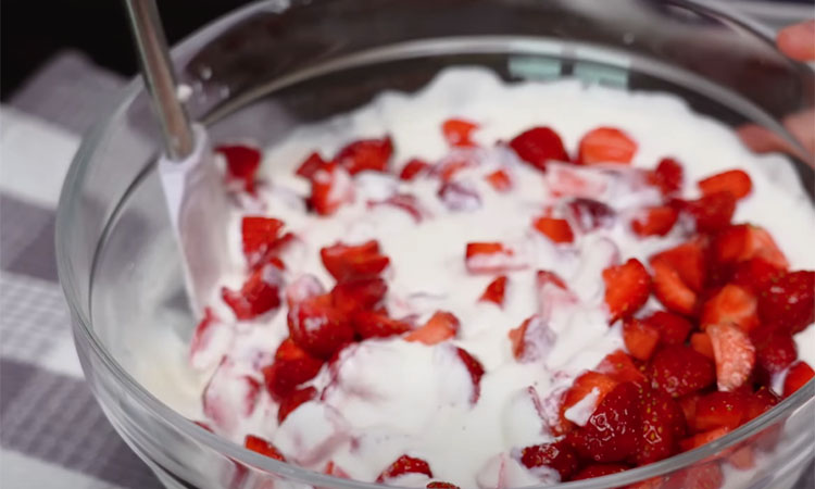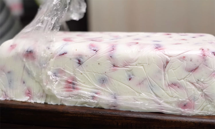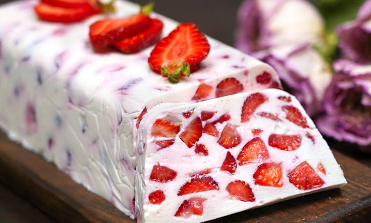 Вмешайте клубнику в творожную массу, распределяя ягоды равномерно. Переложите смесь в форму, застеленную пищевой пленкой, разровняйте поверхность и уберите в холодильник минимум на 2 часа, лучше на ночь. Когда десерт застынет, накройте форму тарелкой, переверните, снимите пленку. Нарежьте порционными кусочками или разложите по креманкам.