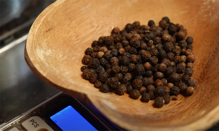 2. Смешайте все сухие специи (черный и душистый перец, гвоздику, мяту, кориандр, мускатный орех, корицу, чили) с лавровым листом. Измельчите их в ступке до мелких кусочков, но не в пыль — в цельном виде они будут давать более резкий, иногда горький вкус. Добавьте половину соли и хорошо перемешайте смесь, чтобы соль равномерно распределилась.